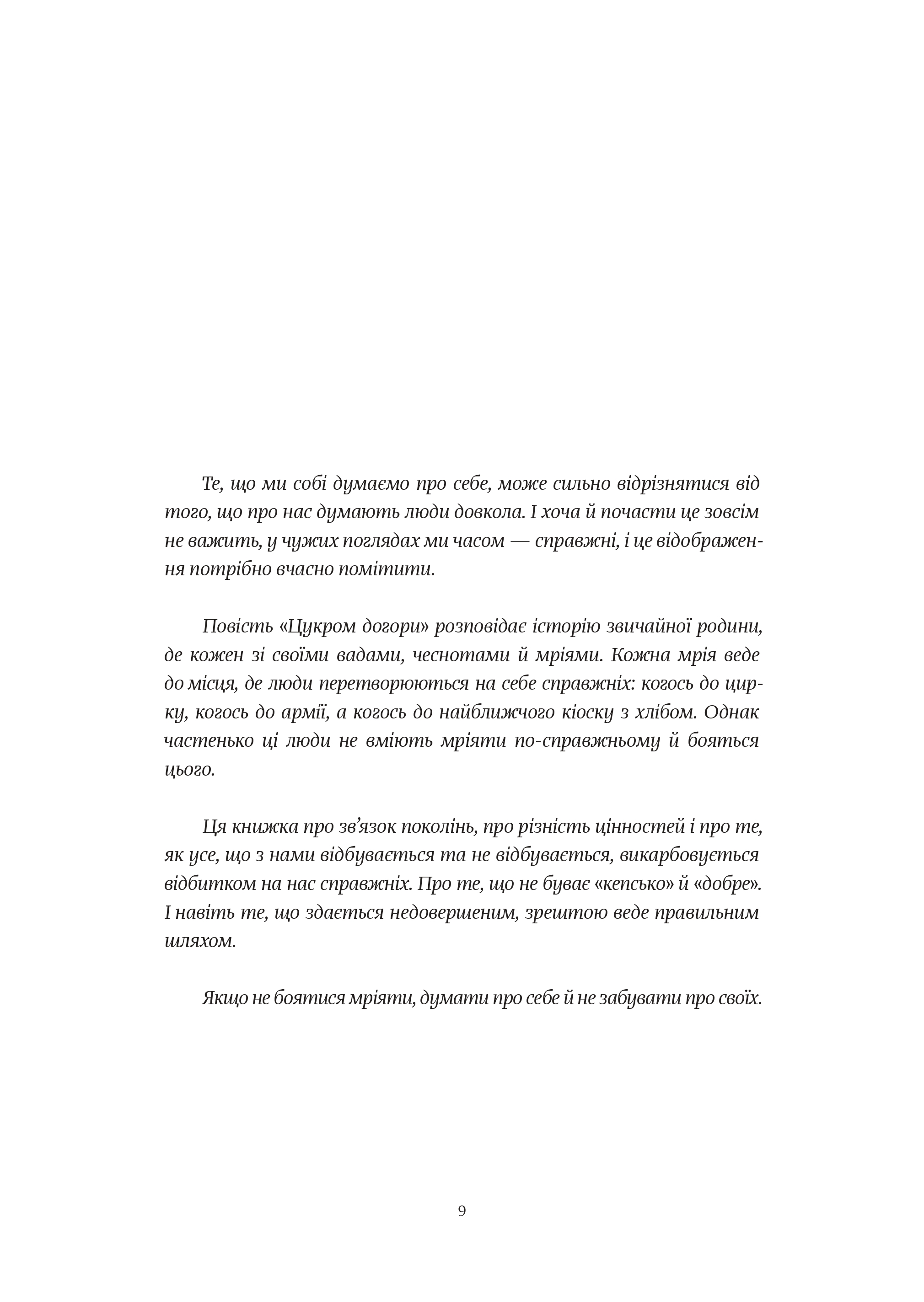 «Цукром догори» — це історія сімох людей і чотирьох поколінь однієї сім’ї. Це звичайна родина, де кожен зі своїми вадами, чеснотами й мріями. Кожна мрія веде до місця, де люди перетворюються на себе справжніх: когось до цирку, когось до армії, а когось — до найближчого кіоску з хлібом. Однак частенько ці люди не вміють і бояться мріяти.